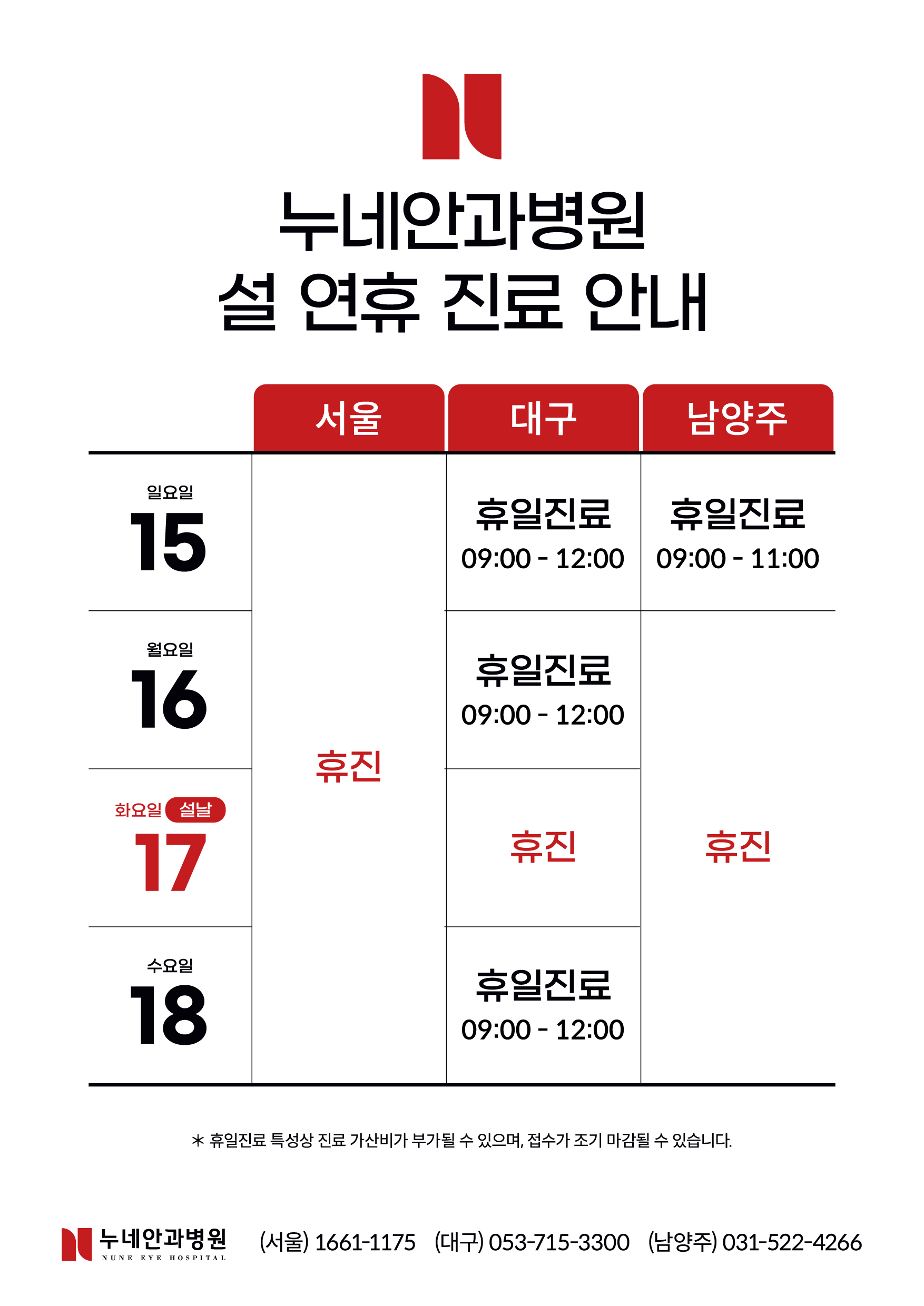 * 휴일진료 특성 상 진료 가산비가 부과될 수 있으며, 접수가 조기 마감될 수 있습니다.
