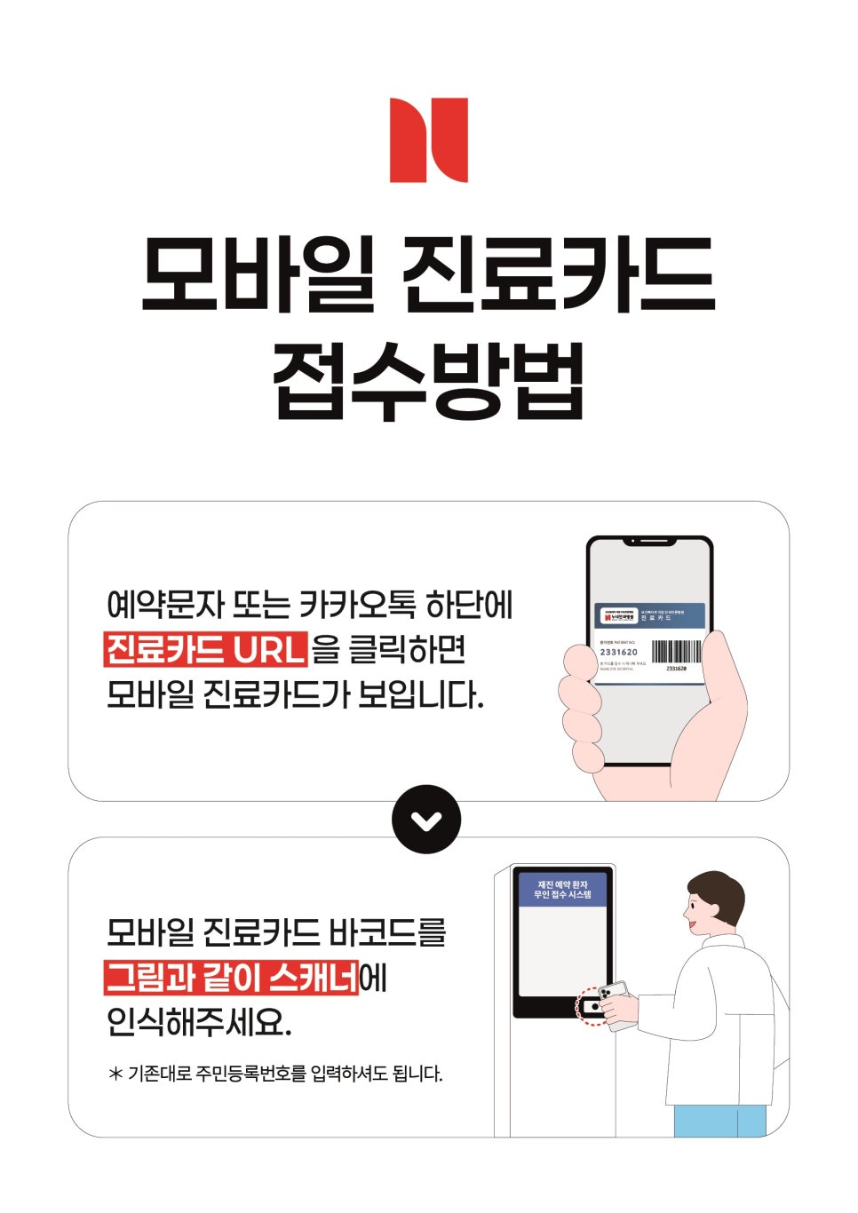 * 무인 접수 단말기(키오스크) 이용 시 해당 바코드를 스캐너에 인식시키면 별도의 번호 입력 없이 접수 완료